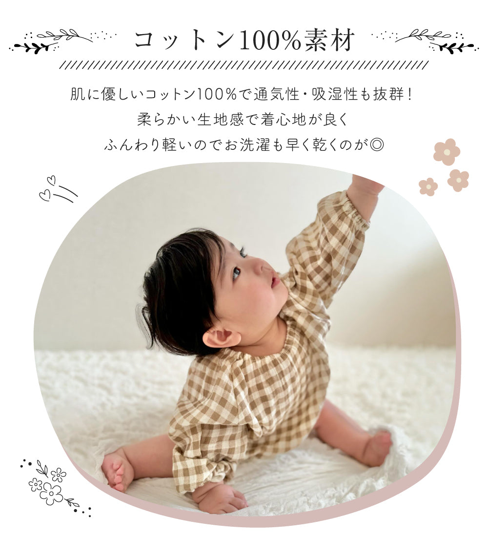 ・股部分はスナップボタン付きでおむつ替えも楽々できます。