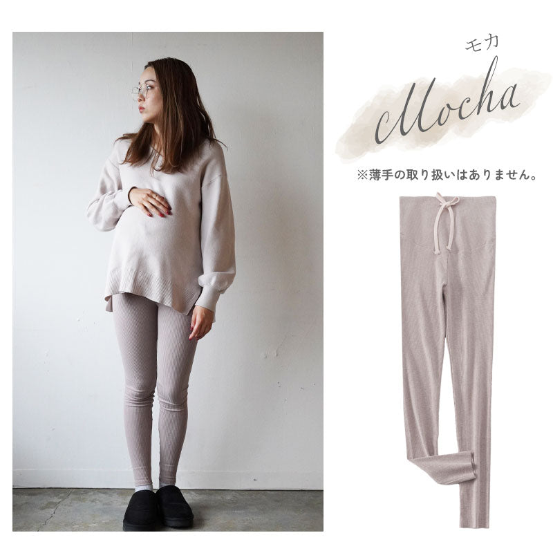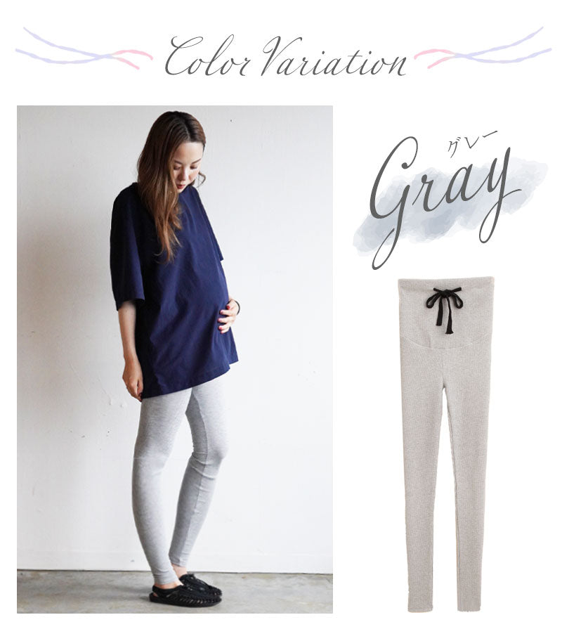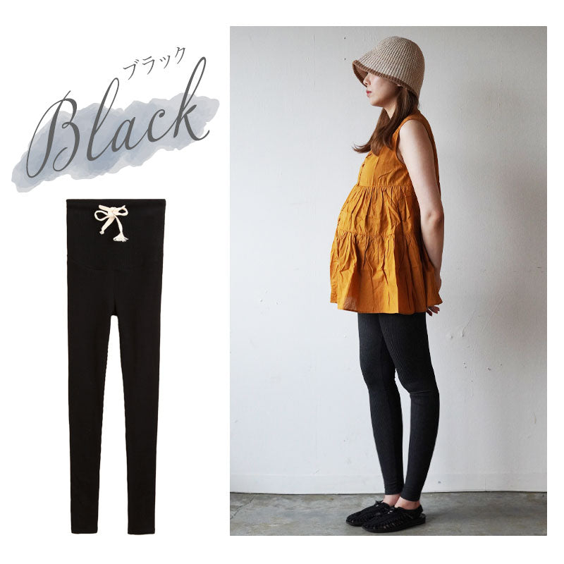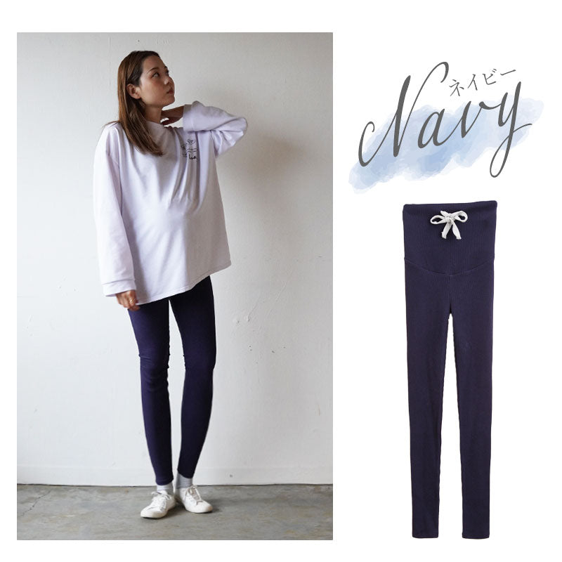 ・お洒落に着こなせる、リブ素材をしようしたマタニティレギンス。3D縫製でお腹の部分も優しく包み込み、ウエスト部分は紐で調節できるので、苦しくならない産前〜産後まで切れる便利なマタニティレギンスです。